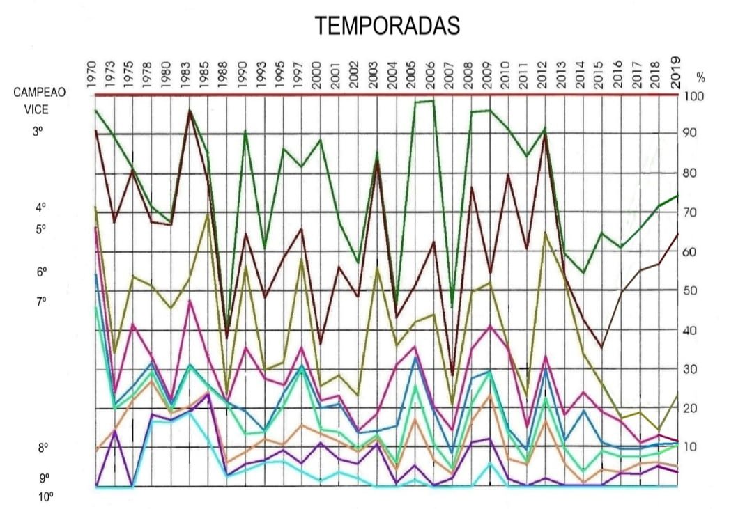 Com todos as percentagens de todas as equipes respeito ao campeão em cada uma das temporadas, aqui temos o seguinte gráfico que nos dá uma clara visão do acontecido nesses anos, e que nos mostra as diferenças registradas entre as diferentes equipes e o campeão: