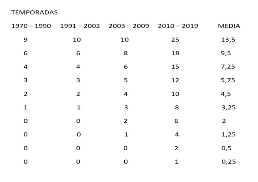Como durante todas essas temporadas, tivemos quatro sistemas diferentes de pontuação vigentes, resultava difícil fazer comparações de maneira proporcional entre elas. Portanto, decidi, em base a esses quatro sistemas, empregar um que fosse a média de todos eles, para evitar as distorções. Este é o sistema obtido e o que usei para fazer os cálculos:
