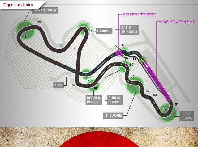 A pista japonesa não sofre alterações significativas. Para esse ano um trechinho novo de asfalto entre a 130R e a chicane que fecha a volta. Nada que vá mudar o ritmo do samba para essa corrida. O circuito continua com somente uma zona de DRS na reta principal, contrariando a prática atual de tentar manter duas áreas.