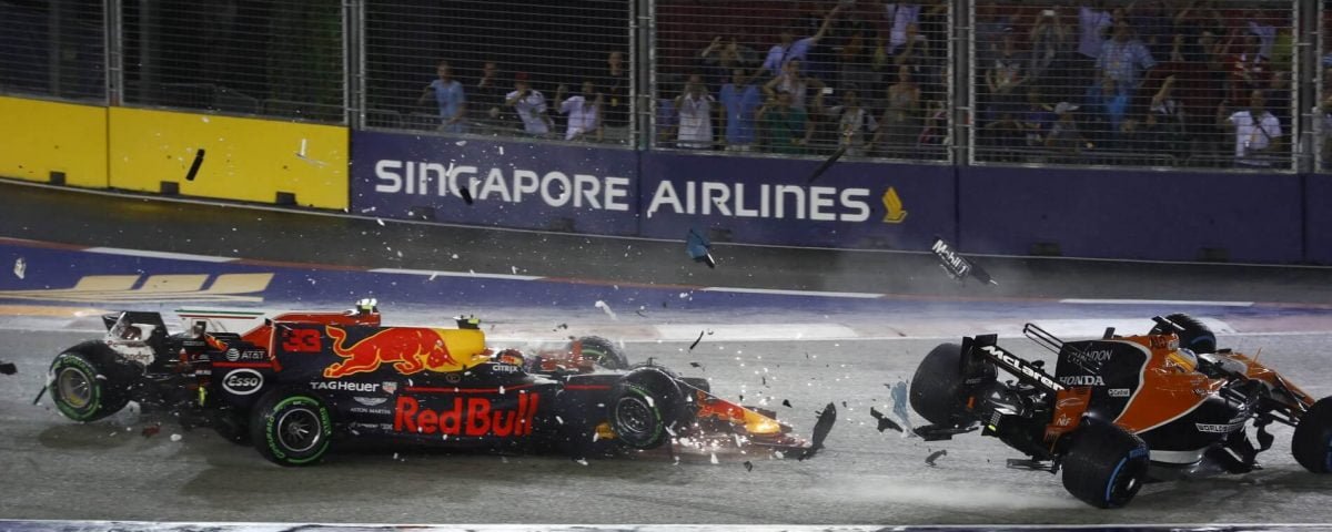Kimi Raikkonen (FIN) Ferrari SF70-H, Max Verstappen (NED) Red Bull Racing RB13 and Fernando Alonso (ESP) McLaren MCL32 crash at the start of the race at Formula One World Championship, Rd14, Singapore Grand Prix, Race, Marina Bay Street Circuit, Singapore, Sunday 17 September 2017.