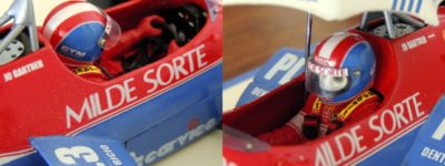 Os decalques foram produzidos com impressão especial em jato de cera – tem decalque nas rodas e até no radiador. Roll-bar e espelhos, delicadíssimos, foram produzidos à mão, assim como o pára-brisa, que não é colado, mas fixado com pinos de aço. Há também outros refinamentos de cair o queixo, como viseira móvel parafusada diretamente no capacete, cintos de segurança em tecido e até as cordas de suporte das asas traseiras. A cereja do bolo? Uma umbrella idêntica à usada na época pela Osella.
