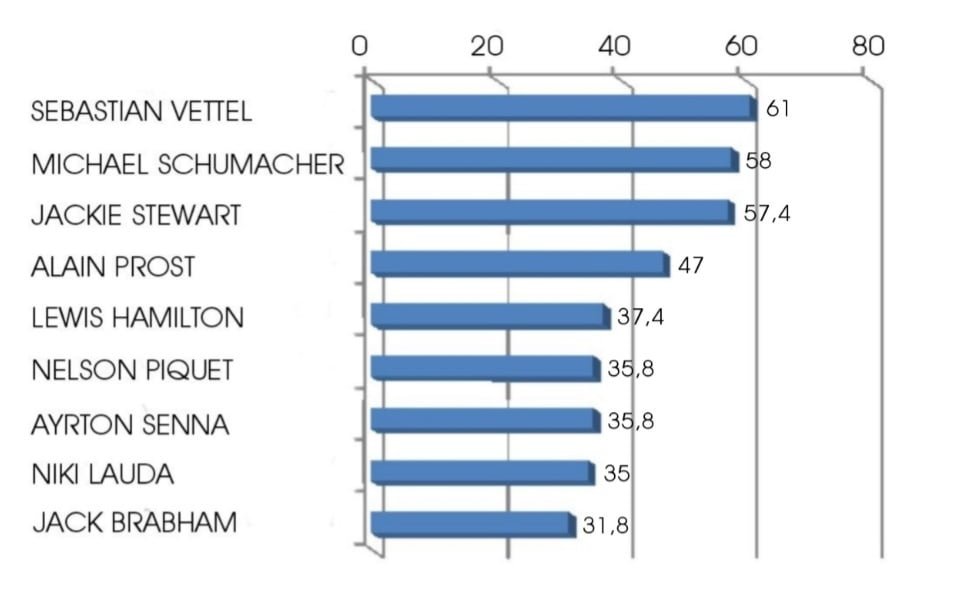 O resultado me parece que, em boa medida, confirma a percepção bastante generalizada que todos tínhamos respeito às vantagens ou desvantagens sob as quais estes pilotos competiram nas temporadas de seus títulos. Assim, no topo desta classificação temos a Sebastian Vettel, seguido bem de perto por Michael Schumacher e por Jackie Stewart, como os pilotos que desfrutaram de um contexto mais favorável para seus interesses, destacando-se sobre o resto. Um pouco abaixo vem Alain Prost e, ainda mais abaixo, Lewis Hamilton. Na continuação temos um empate entre Piquet e Senna, com Lauda justo atrás deles.