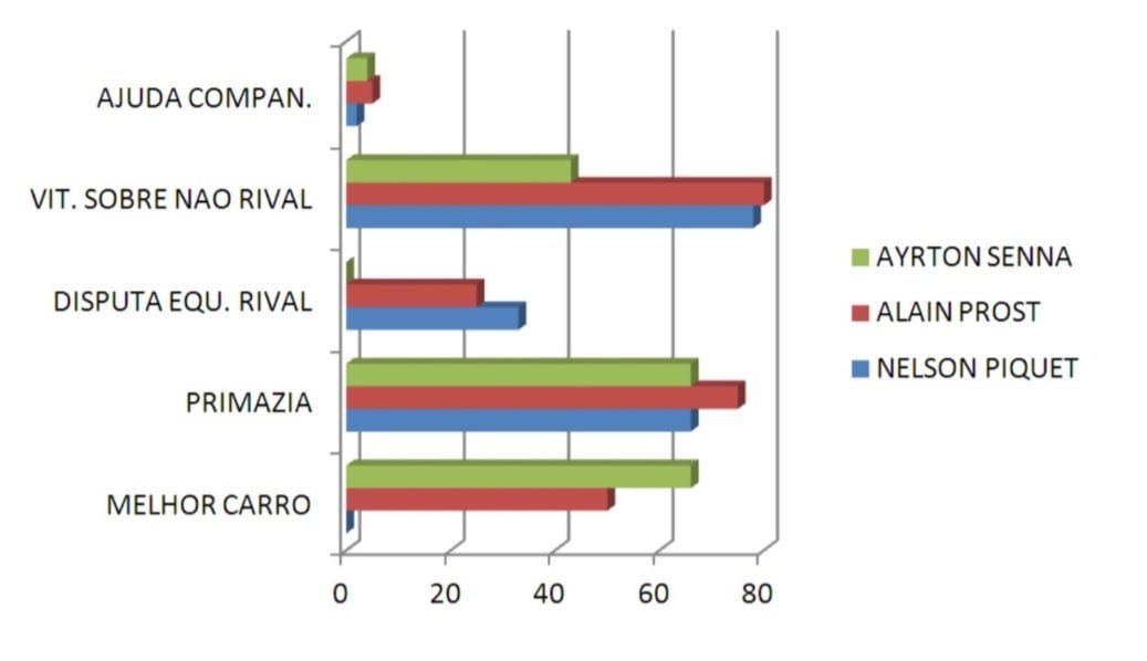 Nossos três seguintes campeões são Nelson Piquet, Alain Prost e Ayrton Senna, que dominariam a formula um por cerca de uma década. Seu gráfico nos deixa os seguintes percentagens: