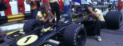 F1 em Interlagos, 1974. Reparem na umbrella nas mãos de Ronnie Peterson em sua Lotus…