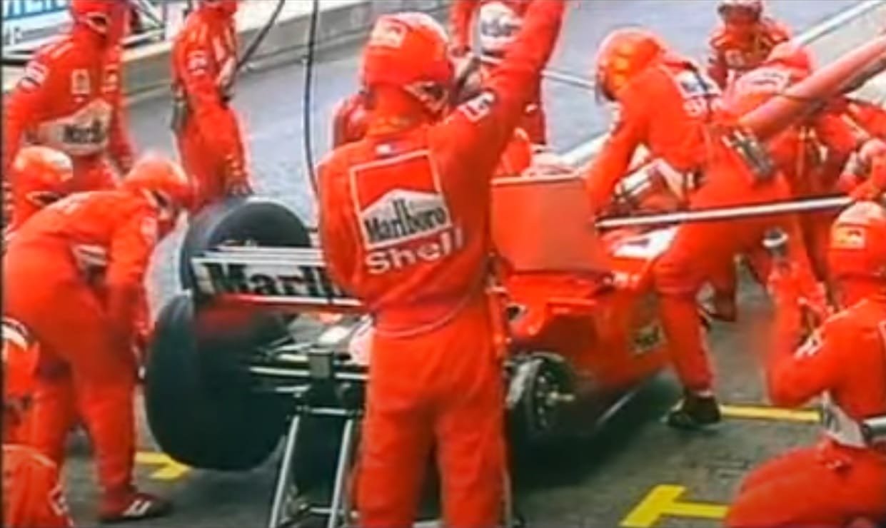 A cena conhecida como “roda fantasma”, ocorrida no GP da Europa daquele ano, realmente é estranha, para dizer o mínimo: Irvine vai aos boxes, e tudo ocorre perfeitamente exceto pelo fato de que o pneu traseiro direito simplesmente havia sido esquecido. Na hora de a Ferrari liberar seu piloto, percebe-se a falha grotesca, e longos segundos se passam até que a peça finalmente seja trazida, devidamente colocada e o carro #4 liberado. À primeira vista, é impossível não flertar com a teoria da conspiração, mas lembrando do histórico ferrarista (Kimi em Valencia e Massa em Singapura, 2008, Sainz na Holanda em 2022, entre outros), prefiro pensar na interminável capacidade da Scuderia em cometer erros bizarros nos boxes – aos quais nem Schumy escapava (Áustria 2003), apesar da ocorrência muito menor.