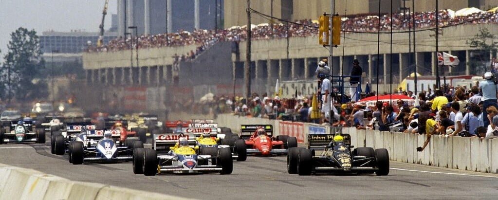 DETROIT STREET CIRCUIT, UNITED STATES OF AMERICA – JUNE 22: Ayrton Senna, Lotus 98T Renault, leads Nigel Mansell, Williams FW11 Honda during the Detroit GP at Detroit Street Circuit on June 22, 1986 in Detroit Street Circuit, United States of America. (Photo by LAT Images)