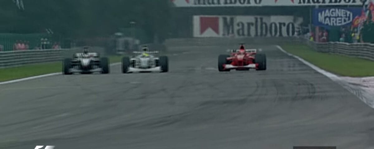 A inventividade e habilidade de Juan Pablo Montoya, conseguindo a ultrapassagem num ponto quase impossível, mas… Michael Schumacher quase estacionou para facilitar o trabalho do rival. O Ferrari do alemão, pelo menos nesta altura da prova, não era páreo para o Williams de Montoya.