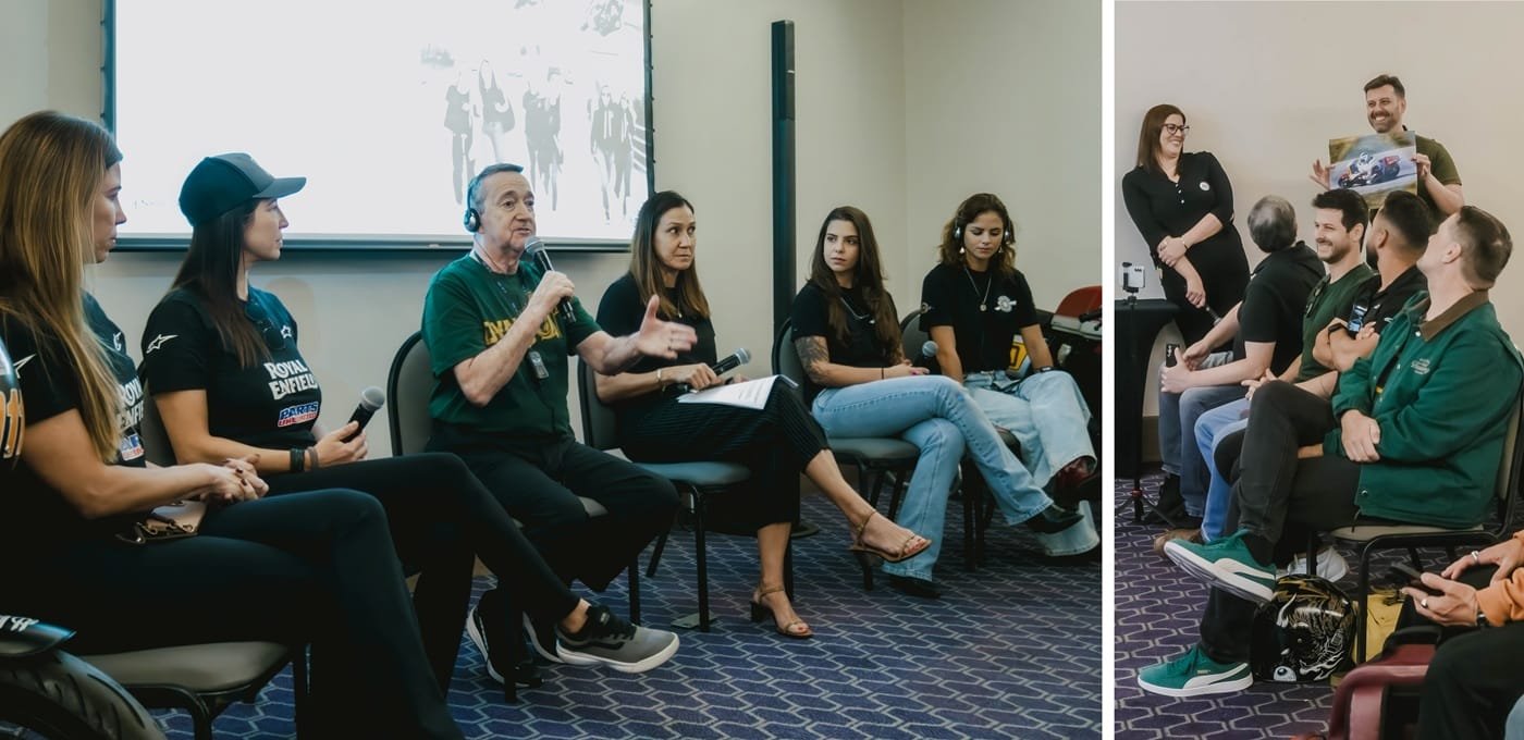 O evento da Royal Enfield apresentou as quatro pilotos brasileiras do programa BTR 2026, do qual Spencer é coach: Karina Simões, Tati Paze, Sany Max e Juliana Chile