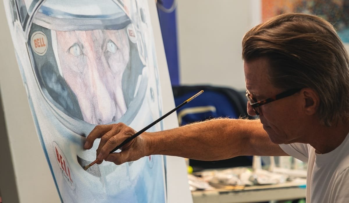 SJ: Então, a pintura é realmente o que agora ocupa, digamos, a maior parte do meu tempo e da minha energia, e minha paixão está definitivamente na pintura agora. Quero dizer, sempre gostei de uma certa estética apurada desde muito jovem, sabe? Como carros bem desenhados, ou arquitetura, roupas, o que você disser… Quero dizer, eu tinha interesse nisso, digamos. Quando comecei a ganhar algum dinheiro na Fórmula 1, sabe, comecei a colecionar algumas obras de arte nas viagens ao redor do mundo e tal, mas nunca, jamais pensei em realmente fazer algo eu mesmo. Nunca, de verdade, durante todo esse período. E então, na Fórmula 1, fiquei muito amigo do Elio de Angelis, nós desenvolvemos uma amizade super próxima em um período bem curto de tempo, então a gente estava sempre junto sabe, saindo pra jantar muito frequentemente, e apenas passando muito tempo juntos, e quando ele sofreu o acidente, sabe, nós estávamos sentados no muro dos boxes em Paul Ricard conversando cinco minutos antes sobre qualquer coisa, ele saiu e aí eu vi aquela grande nuvem de fumaça à distância e quando cheguei lá vi que o carro estava pegando fogo, então corri pra lá. O Alain [Prost] estava lá também e acho que era o Jacques Laffite ou o Alan Jones, não lembro direito, mas enfim, tentamos virar o carro de volta sabe, mas não conseguíamos mover o carro de jeito nenhum… Então toda essa experiência realmente me afetou sabe, de um jeito bem ruim. Eu estava arrasado quando voltei pra casa sabe e tentando processar tudo isso. Por algum motivo, não faço ideia do que me levou a isso, mas fui a uma loja e comprei algumas tintas e uma tela e só quis fazer algo em memória dele sabe? Qualquer coisa, meio como uma terapia acho, mais do que qualquer outra coisa. E foi como se um raio tivesse me atingido, tipo “uau! isso é algo que eu realmente amo fazer”, sabe? então basicamente tenho pintado desde então.