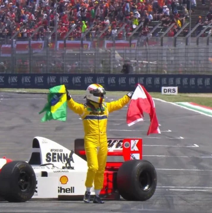 Antes da largada deste domingo, Sebastian Vettel foi à Ímola com uma missão para lá de especial. Com o McLaren MP4/8 que pertencera à Ayrton Senna em 1993, o alemão deu voltas com o belo carro na pista onde o brasileiro perdera a vida pouco mais de trinta anos atrás, emocionando a todos no circuito com a bela homenagem prestada ao inesquecível tricampeão. Para completar, Vettel também não esqueceu de Ratzenberger, usando uma bandeira austríaca.