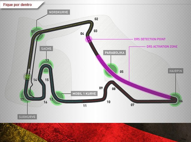 A pista alemã passou de uma configuração de downforce mínimo que existia nos seus tempos áureos para uma pista que necessita de alto grau de pressão aerodinâmica.