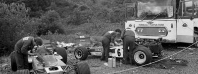 As acomodações, para o público e as equipes, eram bem mais simples naquela altura. Na foto, o que se pode chamar de garagem da equipe Lotus no GP da França 70, disputado no magnífico e perigoso circuito de Clermont Ferrand, em 5 de julho.