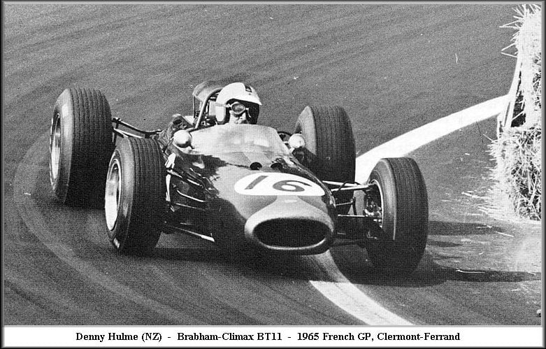 Em 65, Hulme corre ao lado de Jack e Gurney, revezando-se com eles, em alguns GPs largando o três. A primeira corrida de Hulme se dá em Mônaco, onde ele faz uma corrida discreta: 8º no grid, 8º na bandeirada. Salta o GP seguinte e está de volta na França (foto acima), onde larga em 6º e termina em 4º, ao final de uma corrida de recuperação, pois caiu para 14º no final da primeira volta. Faz mais quatro GPs no ano; abandona em três deles e termina em 5º na Holanda.
