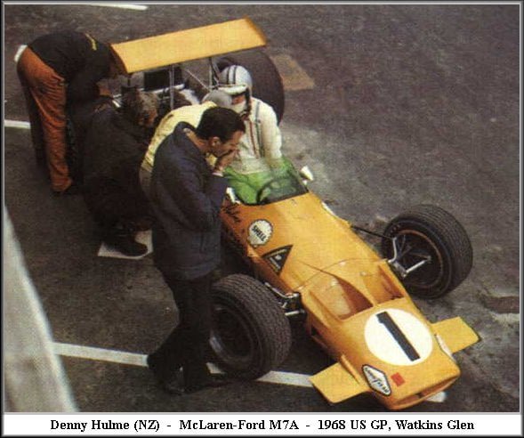 Na nova equipe, o neozelandês segue competitivo e só sai da disputa pelo título na prova final, GP do México, quando tem problemas com o freio do seu carro. Venceu em Monza e no Canadá e pontua em outros cinco GPs, terminando em 3º no Mundial de Pilotos, bem à frente de Bruce. Na foto acima, Hulme e seu McLaren em Watkins Glen, onde abandonou por acidente.