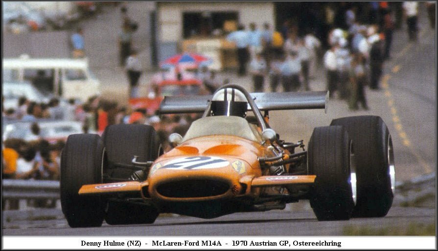 No meio do ano, ao testar um Fórmula Indy de construção da McLaren, Hulme sofre um acidente, queimando-se gravemente. Poucas semanas depois, estava de volta às pistas, terminando em 3º em Mosport, numa prova de CanAm, prendendo a mão queimada ao volante com esparadrapo. Em sua volta à F1, terminou em 4º lugar no GP da França. Na foto acima, Hulme no GP da Áustria, onde abandonou por quebra de motor.
