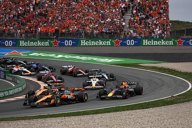 A esperada chuva em Zandvoort, falada desde o início da semana nos três dias de Grande Prêmio dos Países Baixos ficou na ameaça e apenas alguns pingos caíram que pouca diferença fez para a corrida. Com nuvens carregadas no horizonte, a largada foi dada sem maiores problemas e Piastri quase que imediatamente foi para direita, cortando qualquer ameaça de Norris por dentro. Correndo em casa e tentando criar qualquer chance para fazer algo a mais, Max Verstappen optou pelos pneus macios e isso foi uma vantagem na largada, com o neerlandês pulando para segundo e chegando a ficar lado a lado com Piastri na primeira curva, que não teve maiores pudores em fechar o anfitrião do dia.