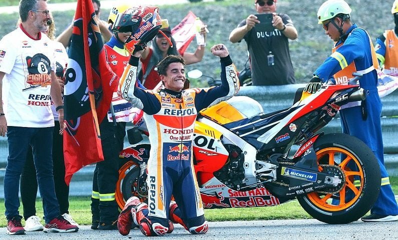 Marc Márquez venceu o Grande Prêmio da Tailândia disputado domingo passado. Com a conquista faturou o título mundial da MotoGP com quatro etapas de antecipação.Trata-sedo sexto título do espanhol na categoria.No total o piloto nascido na Catalunha tem oito mundiais, tendo sido campeão da 125 em 2010 e Moto2 em 2012.
