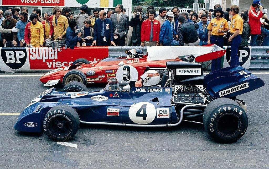 sobre as fotos, Tyrrell e Ferrari de Stewart e Jacky Ickx estão alinhados em 3o e 4o lugares pra largada em Clermont-Ferrand 1972. Stewart, tomou quase dois segundos do pole Chris Amon, mas ganhou a corrida, com Emerson terminando em 2o. Ickx teve problemas e se arrastou até o final da prova, marcada pelo excepcional desempenho de Amon, que só não ganhou por conta de um pneu furado, e também pelo famoso acidente que vitimou Hemult Marko.
