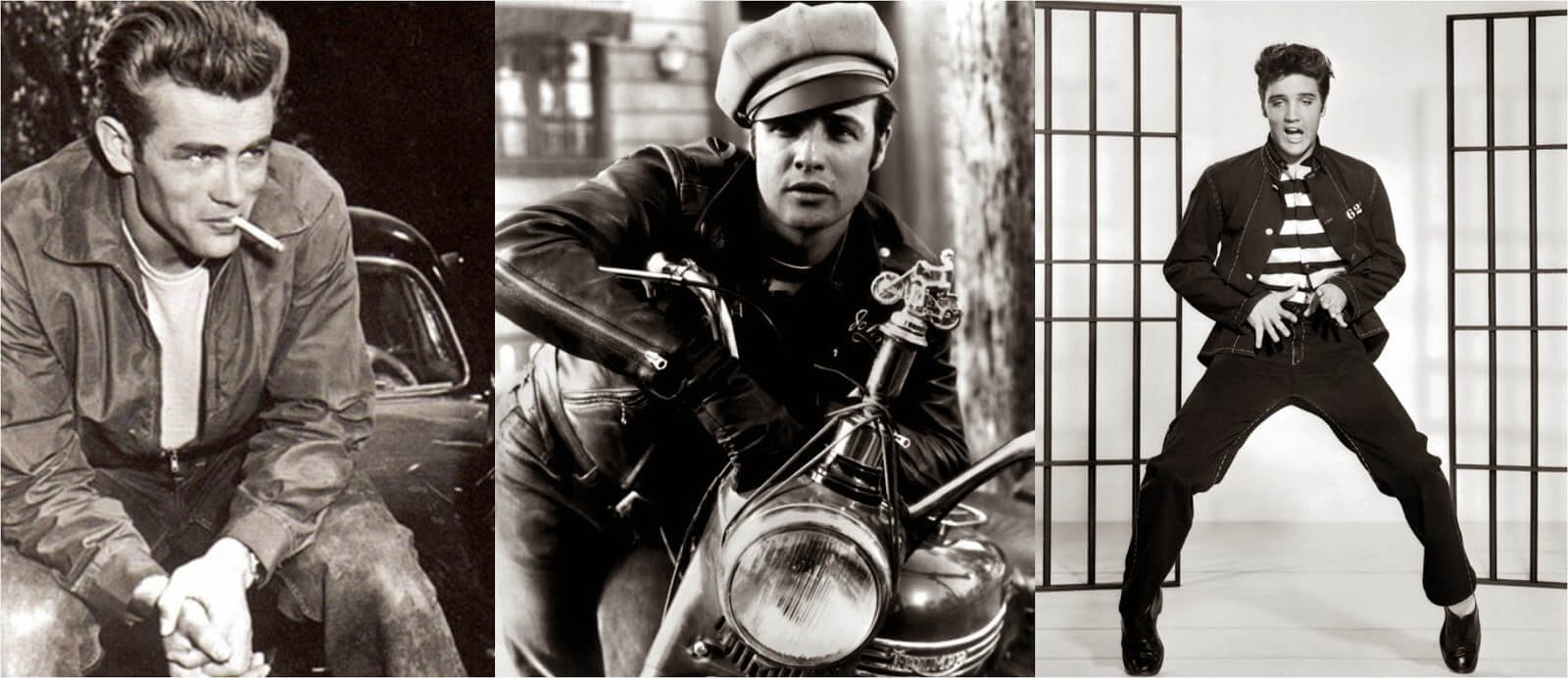 O cinema lançou a moda do garoto rebelde, simbolizada por James Dean, no filme “Juventude Transviada” (1955), que usava blusão de couro e jeans. Marlon Brando também sugeria um visual displicente no filme “Um Bonde Chamado Desejo” (1951), transformando a camiseta branca em um símbolo da juventude rebelde que na época da alta costura lança um visual mais “largado” como contestação do que lhes era imposto.