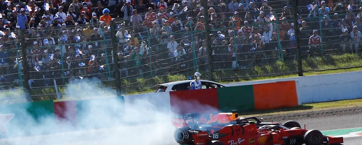 Alguns segundos após o erro de Vettel, Leclerc fez o seu – colidindo com a Red Bull de Max Verstappen