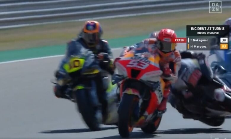 Para Márquez, contudo, o dia ainda não havia terminado. Após ter sido atingido pela moto de Quartararo, seu sistema de largada foi acionado de forma inesperada, e o problema só foi percebido mais à frente, na hora de curvar. Em consequência, o octacampeão seria pivô de nova colisão, desta vez com Nakagami, que também foi ao chão à frente de competidores em plena aceleração.