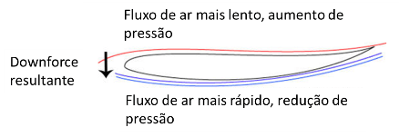 O diagrama abaixo mostra o fluxo de ar que passa através de um apêndice aerodinâmico qualquer. Ao encontrar peça, o fluxo é dividido e passa tanto por cima quanto por baixo da mesma. Devido à geometria da peça, o ar que passa acima perde velocidade, aumentando a pressão do ar na região. Por outro lado, também devido à geometria da peça, o ar que passa por baixo é acelerado, causando uma queda de pressão na região. Assim, havendo uma diferença de pressão entre a parte superior e a parte inferior da peça, ela é empurrada para baixo pela região de mais alta pressão, gerando o efeito conhecido como downforce.