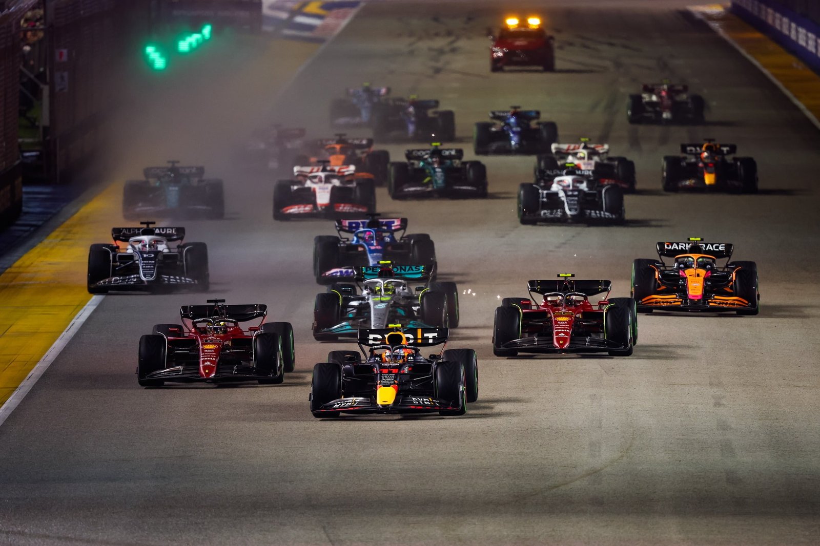 No sábado já dava para perceber que secar a pista de rua de Cingapura não era algo muito fácil. Uma tempestade tropical, algo bastante comum na região, caiu no começo da noite, atrasando a largada em uma hora. Mesmo com o fim da chuva, o piso ainda estava úmido quando os carros estavam preparados para a largada. E logo de cara Pérez mostrou a que veio ao tracionar melhor e tomar a ponta do poleman Charles Leclerc ainda antes da primeira curva. Logo atrás dele Hamilton teve um movimento parecido de Charles e acabou superado por Sainz, após um toque entre os dois na primeira chicane. Isso deu o tom das primeiras voltas, com Pérez em primeiro tendo Leclerc no seu retrovisor e Sainz tendo Hamilton fungando em seu cangote. No entanto, não havia tentativas mais incisivas dos pilotos que atacavam, afinal, fora do traçado a pista estava ainda mais escorregadia.