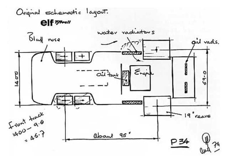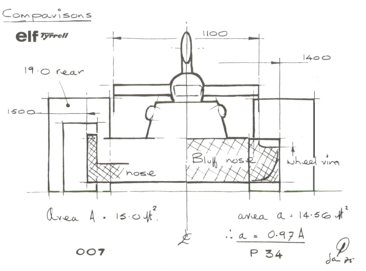 Segundo medições no 007, os pneus dianteiros eram responsáveis por cerca de 12% do arrasto total do carro e, para 1976, um novo regulamento limitava a largura do bico a 1.400mm, fazendo impossível a carenagem completa dos pneus dianteiros, portanto e para se adaptar a esse regulamento, Gardner pensou em reduzir a medida das rodas dianteiras para que estas ficassem ocultas por trás do bico. Porém, como montar rodas menores representa também menor superfície de contato com a pista, isso só se podia compensar com outro par de rodas, como vemos no rascunho esquemático que Derek apresentou a Ken Tyrrell.