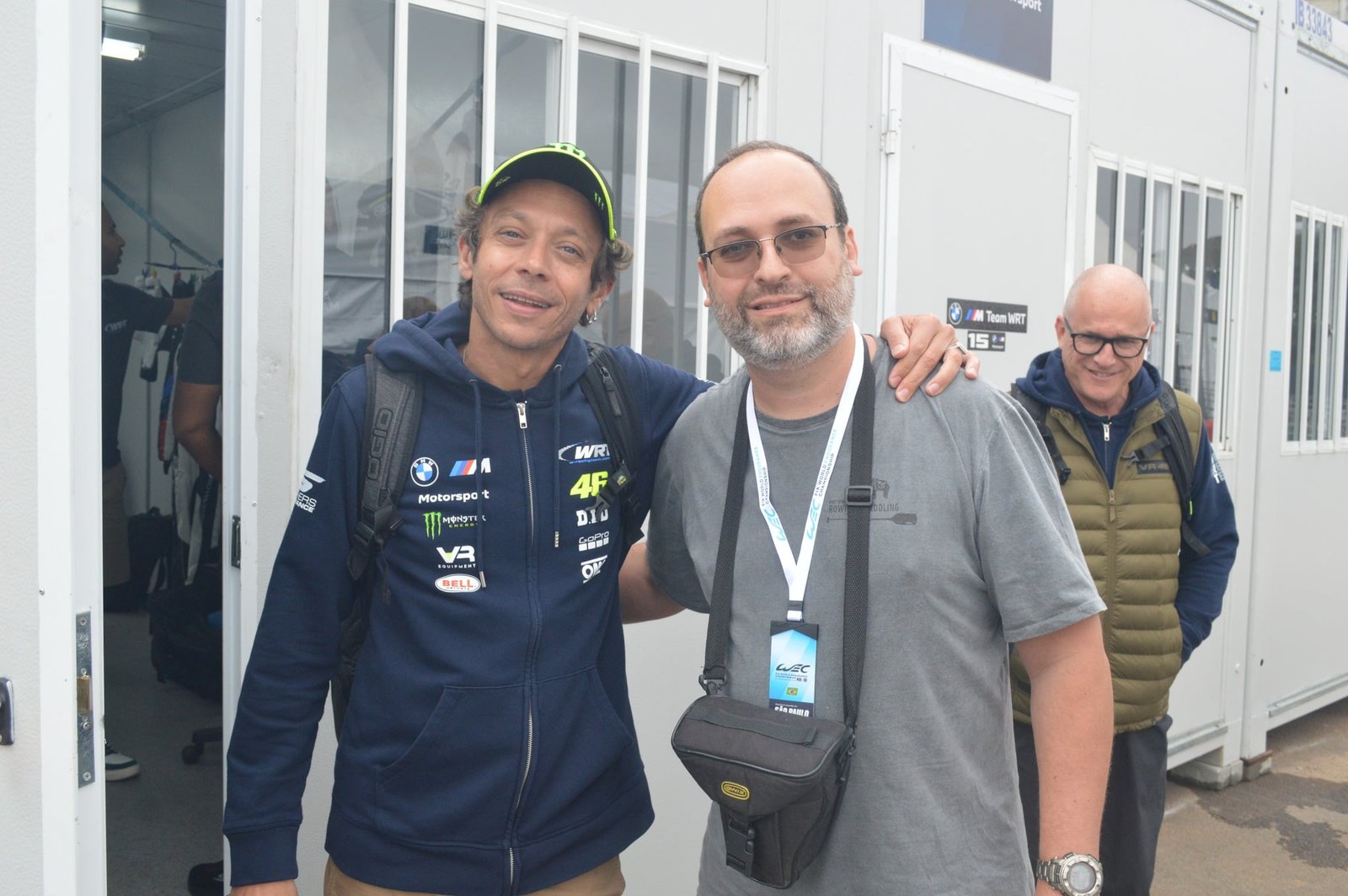 Mas, antes de mergulharmos nas histórias do dia que Lucas iria definir como “aquele em que mais aconteceram coisas relevantes, no somatório”, tanto na minha vida quanto na dele, parece necessário fazer dois apontamentos. O primeiro é que, já no fim da sexta-feira, numa das vezes em que fomos ao Centro de Mídia, Lucas chamou atenção para alguns contêineres enfileirados numa área aparentemente sem atrativos na parte interna do circuito. Fomos lá conferir, e vimos que eram pequenas bases de apoio para as equipes, onde, por exemplo, ficavam os macacões dos pilotos. O de Rossi, especificamente, estava bem visível, dando a senha de que aquele espacinho aparentemente sem expressão deveria ser observado atentamente ao longo do fim de semana. Já o segundo é que no sábado Lucas iria para a pista com sua já citada jaqueta, e se tem algo que já ficou muito claro é que ali, no templo do esporte a motor brasileiro, aquele agasalho faz a um só tempo as vezes de credencial, cartão de visitas e amigo íntimo de diversas personalidades, potencializando absurdamente as experiências de pista à sua volta.