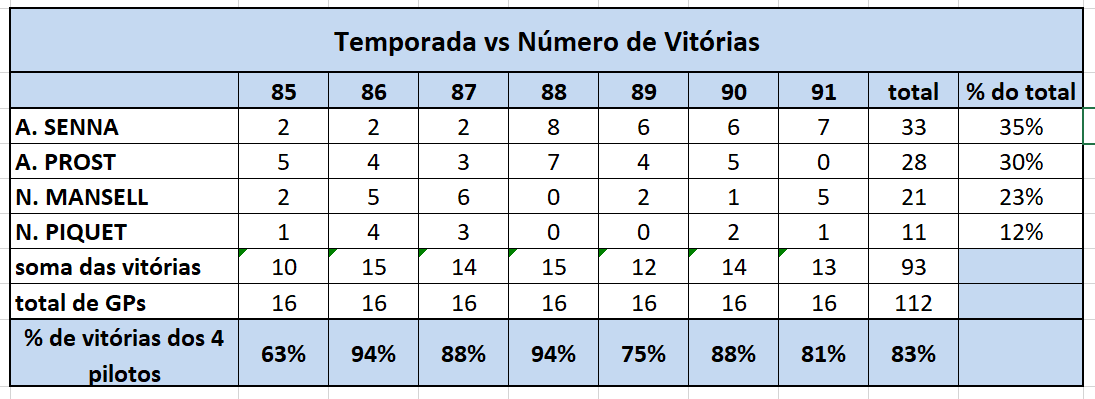 Em números, nossos quatro protagonistas da foto, entre os anos de 1985 até 1991, tiveram os resultados que traduzi na tabela a seguir. Mesmo tendo conquistado todos os títulos de pilotos e com 83% das vitórias nesse período, não dá para contestar que esse foi um dos melhores e mais competitivos períodos da Fórmula 1.
