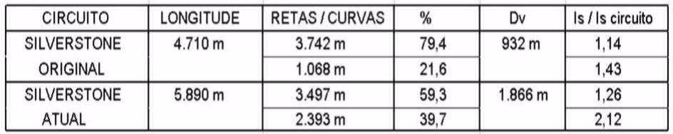 Começando por Silverstone, a simples observação dos traçados do circuito em sua configuração original e atual, logo nos mostra as grandes diferenças entre ambos. De um traçado simples e fluido, com curvas de amplo rádio e angulo aberto, passamos a uma configuração recheia de curvas e cotovelos. Apesar de que a longitude total do circuito aumentou em 1.180 metros, as retas passaram de representar quase 80% do total da extensão do circuito a menos de 60% e, enquanto que no traçado original as curvas tinham um índice de sinuosidade de 1,14, no atual este subiu a 1,26. No que se refere ao índice total do circuito, passamos de 1,43 a 2,12.