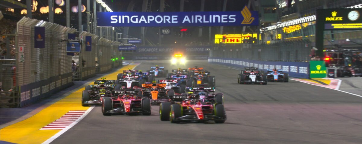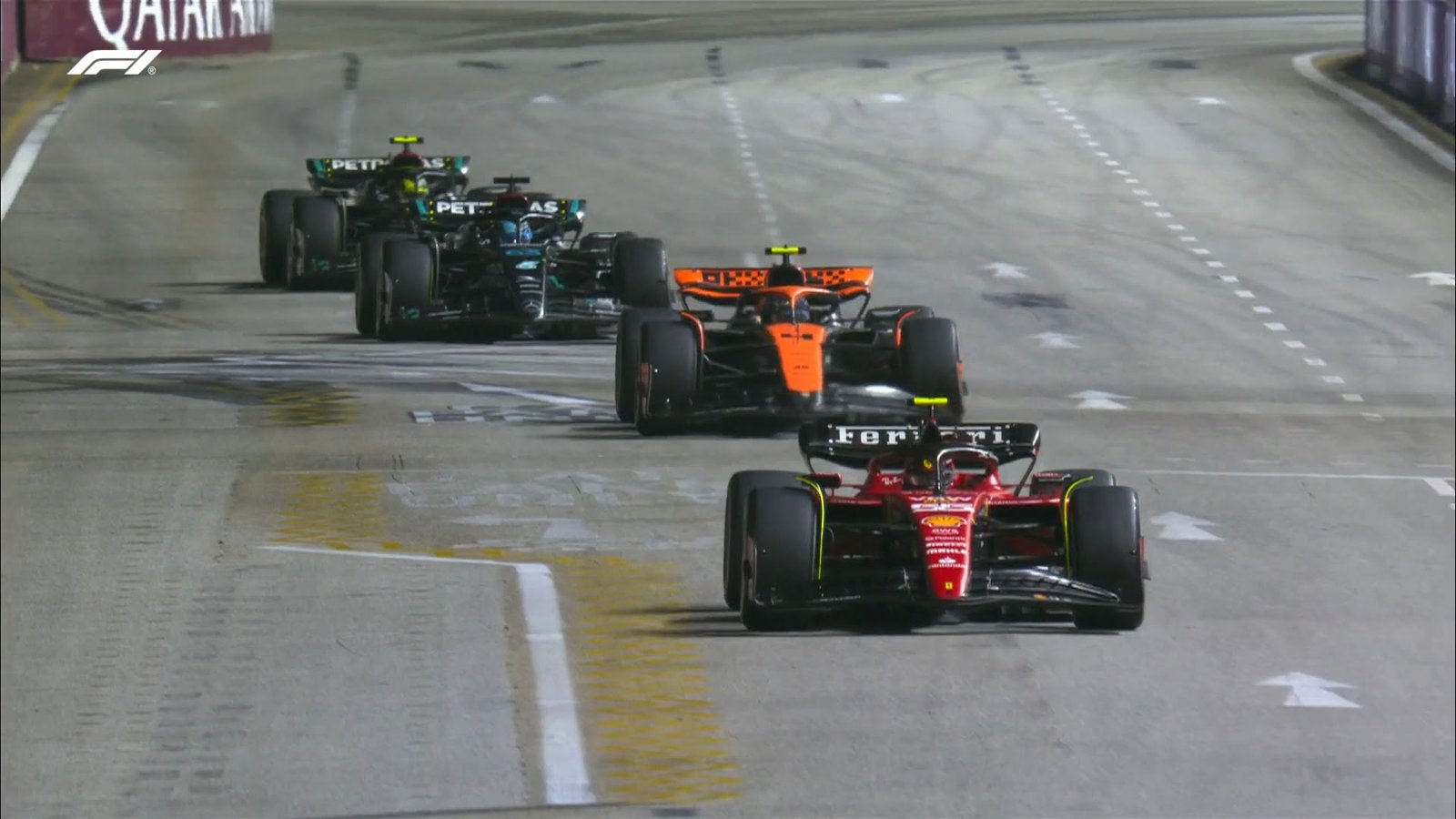 A corrida cingapuriana não foi das mais emocionantes no seu começo, apesar da transmissão insistir no contrário. A largada foi bem convencional, onde a única mudança importante foi Leclerc, montado com os pneus macios, pular melhor do que Russell e assumir a segunda posição, completando a dobradinha da Ferrari. Hamilton fez uma largada agressiva, quase bateu no seu companheiro de equipe Russell e para evitar isso, saiu da pista, retornando em terceiro, mas foi solicitado pela equipe a voltar à quinta posição original, mesmo que depois a direção de prova dissesse que Hamilton até pudesse ficar na frente de Norris. A partir de então, começou uma espécie de procissão para todos os pilotos fazerem os pneus funcionarem na corrida mais longa do calendário. Sabedora que é uma das equipes que mais magoam a borracha da Pirelli, a Ferrari tratou de estabelecer uma tática em torno da vitória. Mesmo sendo o queridinho do time, Leclerc ficou como o boi de piranha para fazer funcionar a estratégia de Sainz. Com a Mercedes tendo um melhor ritmo de corrida, a Ferrari sabia que um undercut era não apenas possível, como bem provável e por isso, fez com que Leclerc segurasse o pelotão o máximo possível, se tornando um escudeiro para Sainz. A tática nem sempre funcionou da melhor maneira, seja pelo pé pesado de Charles, como pela ótima visão de Sainz. Se acelerasse demais, Sainz poderia ter problemas de desgaste de pneus e por isso preferiu não forçar tanto, guardando seus pneus, enquanto Leclerc fazia o jogo sujo. Isso significava um pelotão compacto e os líderes andando até 10s mais lentos que os tempos conseguidos na classificação. A corrida estava morna, quando o horrível Logan Sargeant passou reto com seu Williams e mesmo não ficando parado no muro e tendo danos relativamente pequenos, a direção de prova resolveu colocar o Safety-Car na pista de forma bem discutível, lembrando aquelas bandeiras amarelas da Nascar ‘por detritos’. Que nada mais é do que uma tentativa artificial da Nascar em mexer na corrida. Tão americana quanto a Nascar, a Liberty traz algumas coisas que simplesmente não combinam com a F1, mas não se pode negar que essa manobra para lá de discutível da direção de prova modificou um pouco o andamento da corrida.