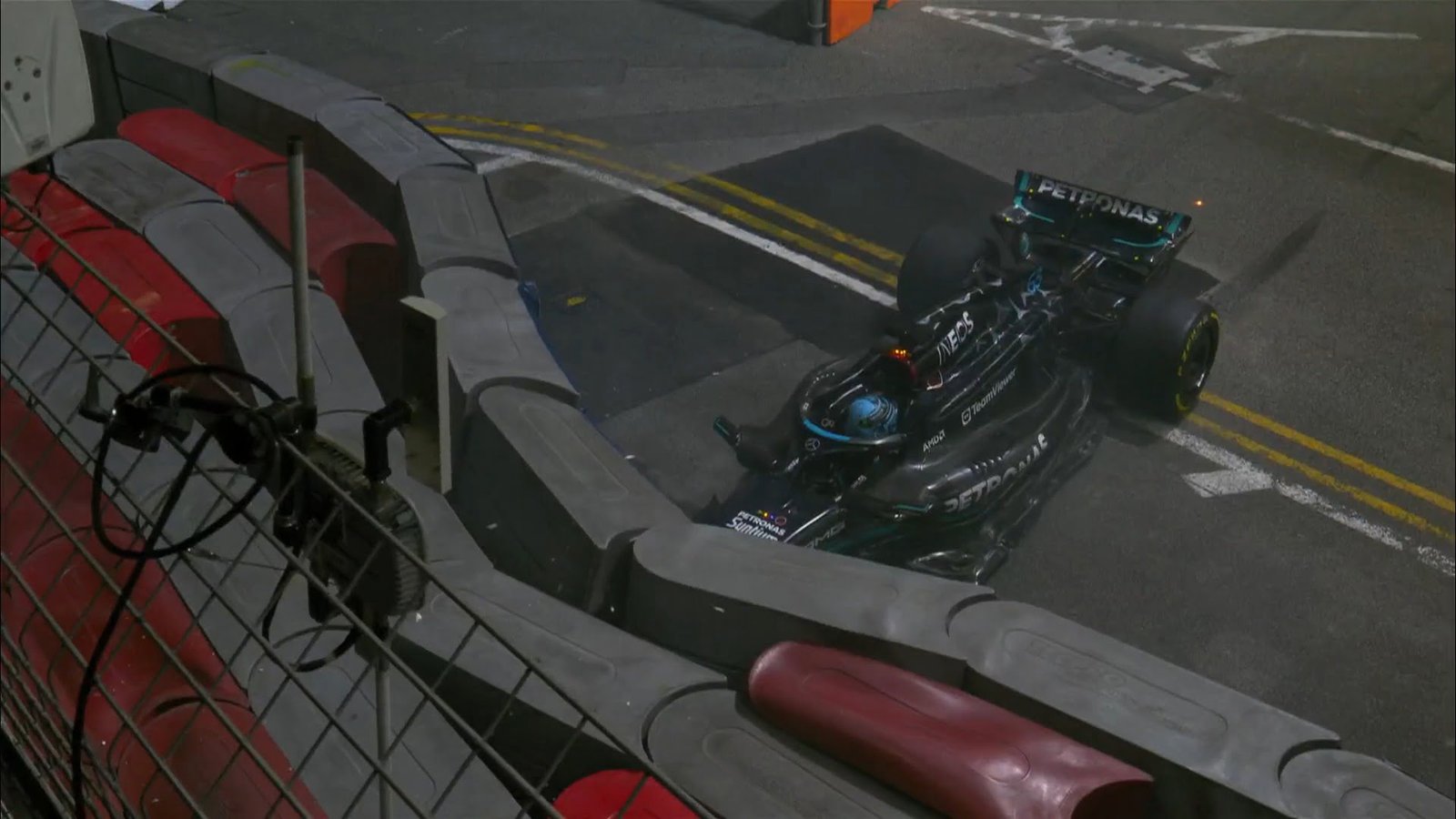 A Ferrari pretendia esticar o máximo do stint com pneus médios e ter uma boa margem para colocar os duros. O Safety-Car fez com que a Ferrari antecipasse os pit-stops e para piorar a situação, Leclerc teve que ficar parado mais tempo do que o normal por causa do tráfego dentro do pit-lane, fazendo com que Sainz perdesse seu escudeiro, tendo Russell em seu encalço. O SC também estragou bastante a estratégia da Red Bull. Mesmo Max Verstappen ganhando algumas posições no início de prova, o neerlandês entrou na pasmaceira do pelotão e preferiu ficar na oitava posição, atrás da briga entre Alonso e Ocon. Contudo, Max e Checo estavam calçados com pneus duros, o que indicava que fariam a tática inversa das outras equipes, ou seja, eles teriam pneus melhores nas fases derradeiras da corrida. No entanto, a dupla da Red Bull não parou no SC e mesmo pulando para segundo com a parada da maioria do grid, Max se tornou um alvo fácil com seu problemático (pelo menos em Cingapura) Red Bull, o mesmo acontecendo com Pérez um pouco mais atrás. Com ninguém mais parando até bandeirada e os dois pilotos da Red Bull tendo que parar obrigatoriamente, a estratégia da Red Bull parecia condenada, com Verstappen e Pérez caindo para as profundezas do pelotão. Enquanto isso, Sainz dava um show de controle de conservação de pneus, ao mesmo tempo em que não sofria maiores ataques de Russell. O próprio inglês parecia impaciente com a situação, onde via que tinha mais ritmo do que Sainz, mas era incapaz de ataca-lo. Com Sainz brincando com o seu ritmo, logo um longo pelotão se formou até o sexto colocado Leclerc.