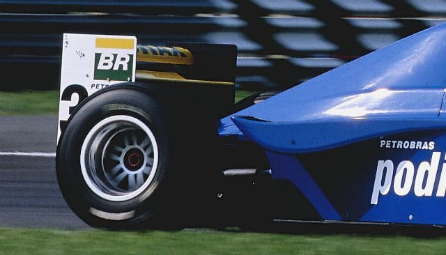 Nesta imagem é possível notar a diferença entre os pneus dianteiros e o ganho em arrasto que advinha da ideia da Tyrrell.