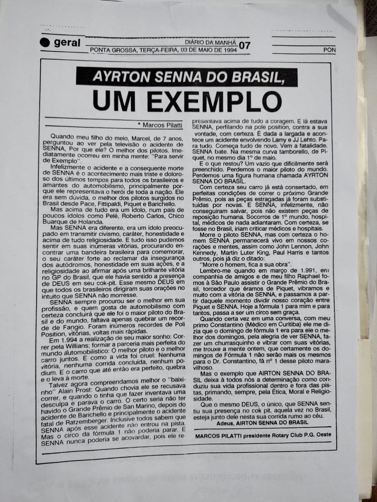 Como disse acima, quando da tragédia daquele fim de semana, eu tinha apenas 7 anos e, além das minhas memórias particulares do ocorrido, me acompanhou por mais de 30 anos o texto escrito por meu pai, publicado na terça-feira, 03 de maio de 1994. O veículo foi um jornal da cidade onde nasci, Ponta Grossa, interior do Paraná. Tenho comigo até hoje o original, e a primeira frase nunca saiu da minha cabeça [ver a imagem abaixo]: “Quando meu filho do meio, Marcel, de 7 anos, perguntou ao ver pela televisão o acidente de Senna, ‘Por que ele?’…”.