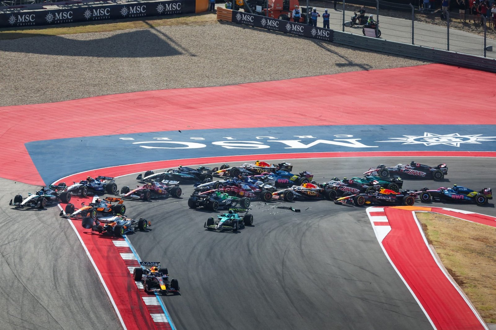 A FIA deu o veredicto de que o incidente da primeira curva foi coisa de corrida, numa pista muito larga juntamente a uma curva bastante fechada e em subida, mas pode-se apontar alguns culpados pela carambola da primeira volta da Sprint Race. Líder do campeonato, Piastri ficou no meio de vários carros na freada e após o melê em Singapura, a McLaren deve ter pedido pelo amor de todos os deuses para que seus pilotos não se tocassem. Com Norris à sua esquerda, Piastri tentou fazer a curva a mais fechada possível, mas o australiano se ‘esqueceu’ de combinar com Nico Hulkenberg. O experiente piloto da Sauber parecia indeciso onde colocar seu carro no aproche da curva um, se colocando numa situação delicada, ainda mais com Fernando Alonso se metendo por dentro. Quando Piastri fez a curva, Hulkenberg acertou a McLaren em cheio, levantando o carro de Oscar do chão, que aterrissou… em cima do carro de Norris!